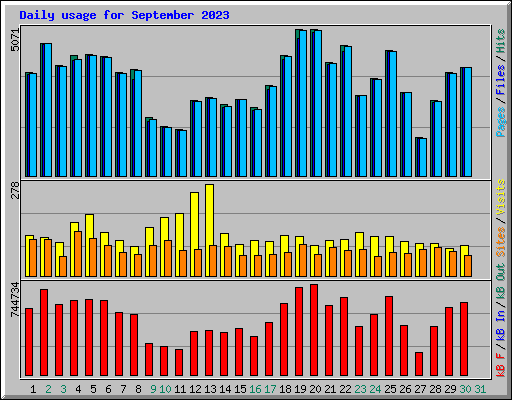 | Day | Hits | Files | Pages | Visits | Sites | kB F | kB In | kB Out | ||||||||